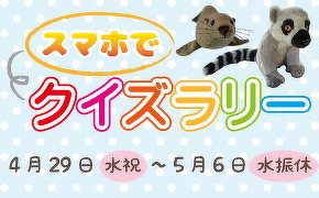 イベントスケジュール♪ 4/29(水祝)~5/6(水振休) スマホでクイズラリー 園内に設置しているクイズ問題のQRコードをスマートフォンで読み取り、応募してください。全問正解された方の中から抽選で70名様に景品をお...