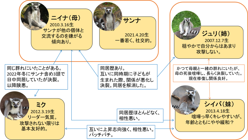 現在、当園で飼育しているワオキツネザルたちはオス2頭、メス6頭の計8頭です。このうち、病院だよりでおなじみのコナツ(メス)は病院で余生を過ごしています。また、2頭のオス、ウテウテ(父)とノボリ(息子)の父子は、獣舎とは別の非公開施設で暮らしています。残る個体、獣舎で暮らす5頭のメスたちについて、2024年4月現在のグループ構成とそれぞれの関係を示したのが、下の図です。