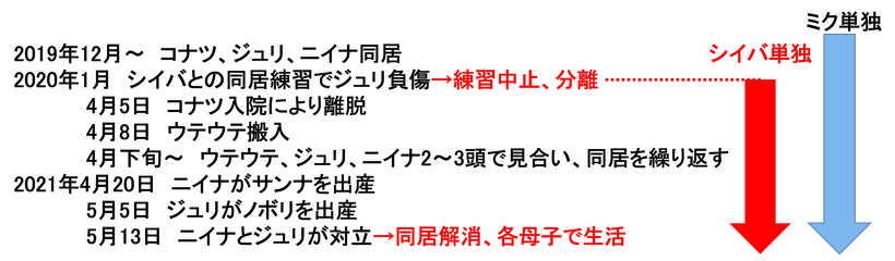 ニイナとジュリの決裂後、再び母子同士4頭での同居練習も行いましたが、互いに険悪な状態から抜け出すことができず、2021年7月以降は子どもの安全を最優先に、いずれも母子のみでそれぞれ生活することになりました。その他の組み合わせ、例えばシイバとジュリ・ノボリ母子や、ミクとシイバなど、様々な組み合わせで見合いや同居を試みましたが、どの組み合わせも距離が縮まらなかったり喧嘩したりとうまくいかないままでした。