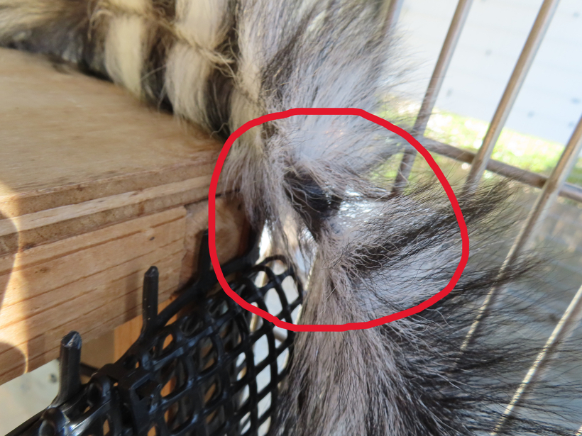 はじめは大好物も残してしまうぐらい食欲が落ちていたようでしたが、数日経つにつれて少しずつ周囲の環境に慣れたのか、食べる量が増えていきました。体重測定の頻度も週1回だったところを3日に1回程度に増やし、体調を気遣う日々が続きました。隣室にいる他の動物(鳥インフルエンザ対策で展示場から引っ越してきた水鳥や、繁殖のために移動してきたプレーリードッグなど)の動きや音にも、はじめは過剰に反応し、部屋中を飛び回ったりするなどパニック状態になっていましたが、時間とともにそれにも慣れた様子でした。やっと環境に慣れてくれたとホッとしていたのも束の間、12月初旬には室内に血痕を発見しました。母娘で闘争したのかと慌てて原因を探ったところ、Nの尾から断続的に出血していることが分かりました。もともとNの尾には小さな瘤(長年あるもので、原因は不明です)があるのですが、自分で気にして齧ってしまったのか、瘤に小さな穴が開いていたのです。少なからずストレスが影響していたのかもしれません。