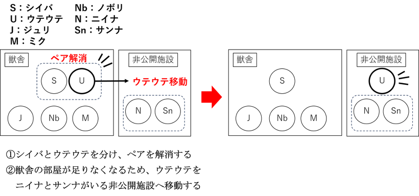 ここからさらに他の個体を巻き込んだ、パズルのような部屋替えと施設移動について考える必要が出てきました。手順としては