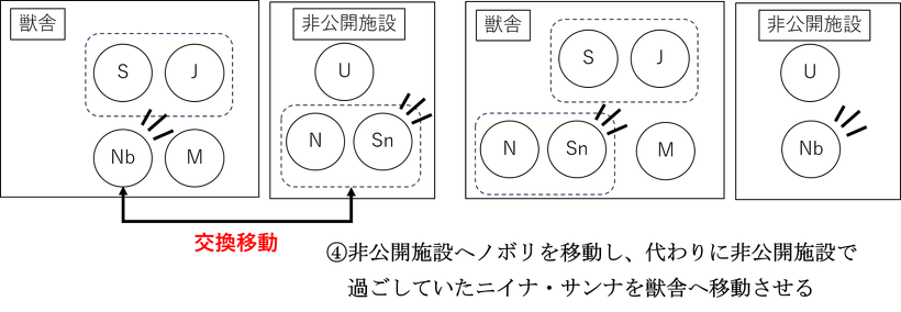 ④非公開施設へノボリを移動し、代わりに非公開施設で過ごしていたニイナ・サンナを獣舎へ移動させる