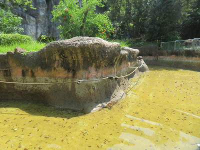 よくワオキツネザルの展示場を見た来園者から、「檻や金網がないのに逃げていかないのか」と聞かれます。至極もっともな疑問です。展示場内の木から木へと飛び移ったり、数メートルの大ジャンプを披露しているワオキツネザルたちを見ると、余計にそう思われる様です。ワオキツネザルたちが外へ逃げていかない秘密は、島状の展示場の周りを囲う、「ウォーターモート」と呼ばれる濠(ほり)にあります。