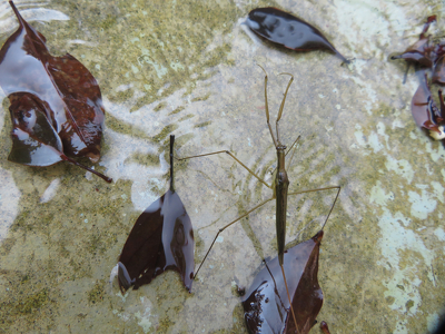 もちろんモート清掃の際に出てきた生き物たちは近くの水場に移動させたり、バケツに避難させて清掃後に戻したりしています。住処である落ち葉や餌となる藻を清掃してしまうのは申し訳ないですが、彼らもたくましいもので、しっかりと翌月までに成長し、あるいはモートの外へ旅立っているようです。月に1回水を全て入れ替えているとはいえ、ビオトープのように生き物たちの広いモートの清生活の場として機能している面もあるようです。広いモートを清掃するのは大変な力仕事ですが、様々な生き物たちを観察するのは毎回楽しみです。