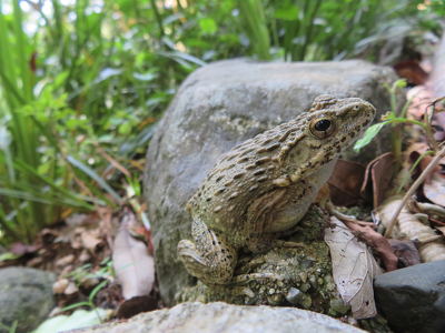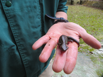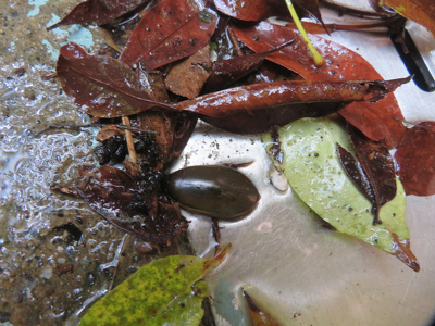 水棲昆虫では、トンボの幼虫であるヤゴ、コガタノゲンゴロウ、ガムシ、マツモムシ、ミズカマキリなど、野外で探すとなかなか見つけられないような種類が簡単に見つかります。担当は家で様々な昆虫を飼育しているぐらい昆虫好きなのですが、特にコガタノゲンゴロウのつやつやと丸い体を初めて見つけたときは、感動しました。両生類もいろいろ現れます。特に5~7月の雨が多く温かい時期はツチガエルやアマガエル、アカハライモリがたくさんいます。幼生(おたまじゃくし)から成体まで、成長段階が違う両生類たちをそれぞれ観察することができます。