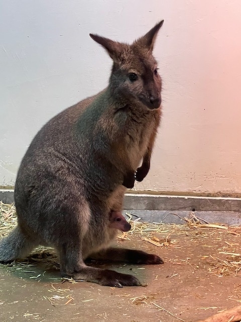 【動物ブログ】飼育日記 ベネットアカクビワラビー「子どもが生まれました!」 2021年12月25日(土) ベネットアカクビワラビー 12/6、「のどか」の育児のう(お腹のふくろ)に入っていた子どもが顔を出しました。一度顔を出してから何度も顔を出すようになり、初々しい姿をよく確認できるようになりました。ワラビーやカンガルーの子どもは、かなり小さい状態で生まれて育児のうに入るので正確にいつ生まれたのか、わかりませんので育児のうから顔を出した日を誕生日としています。「アオ」や「ウメ」にも子どもがいる様子です。もし顔を出しているのを見つけたら飼育員さんに教えてくださいね。