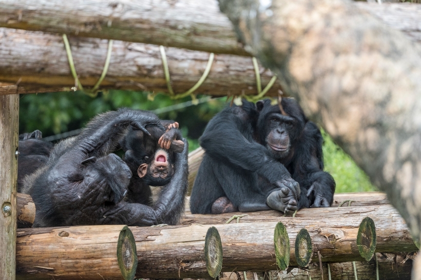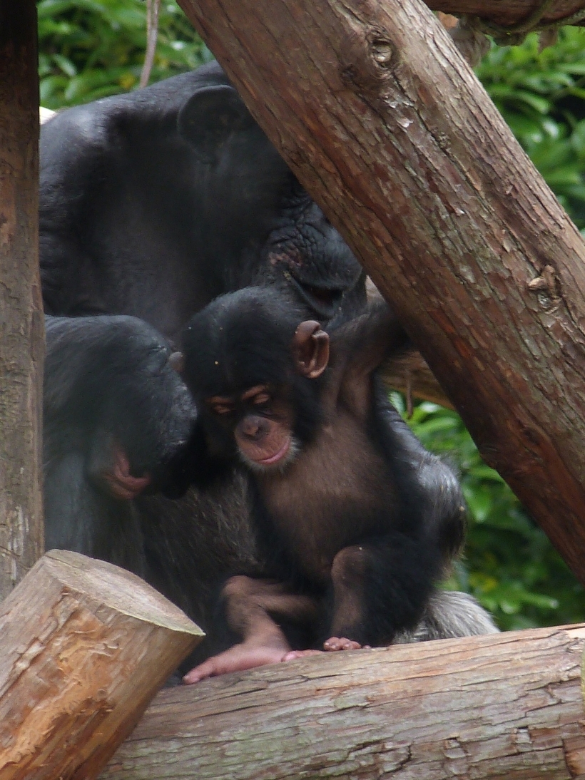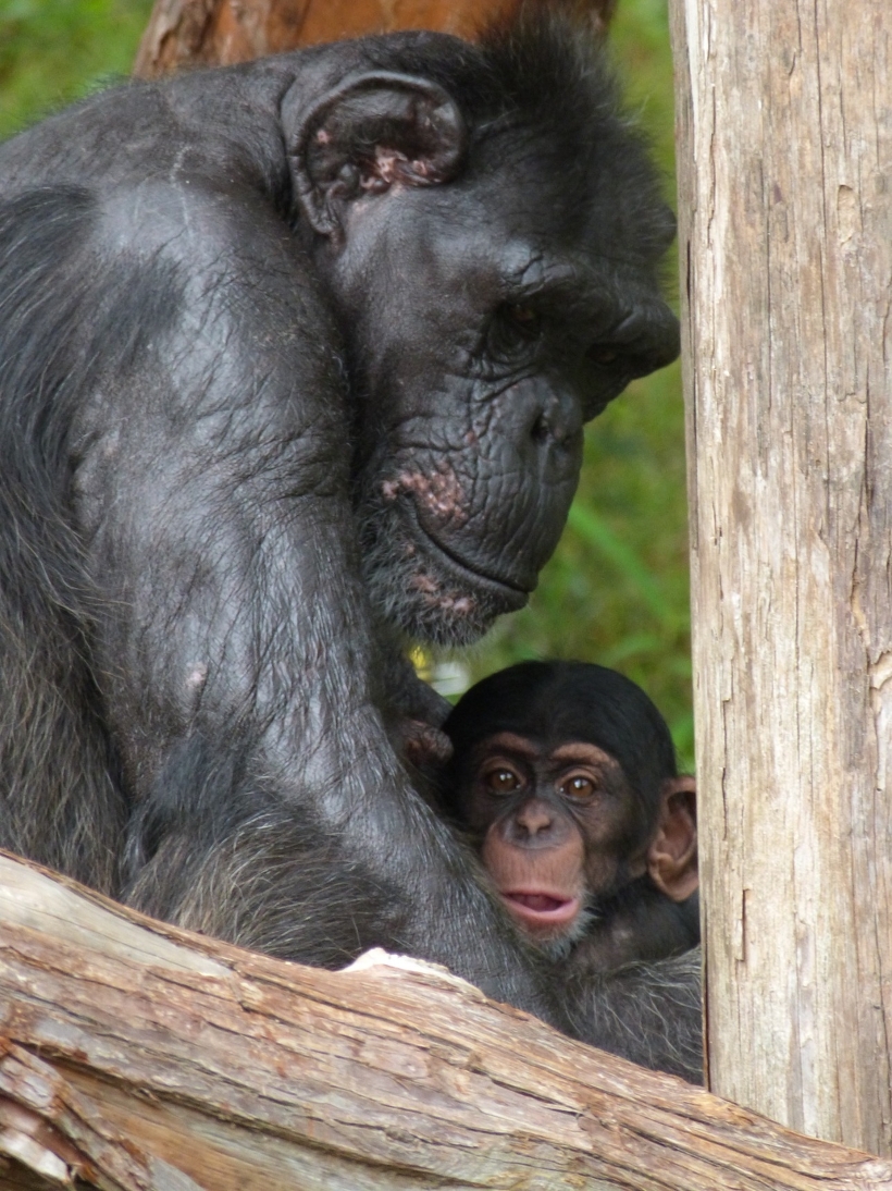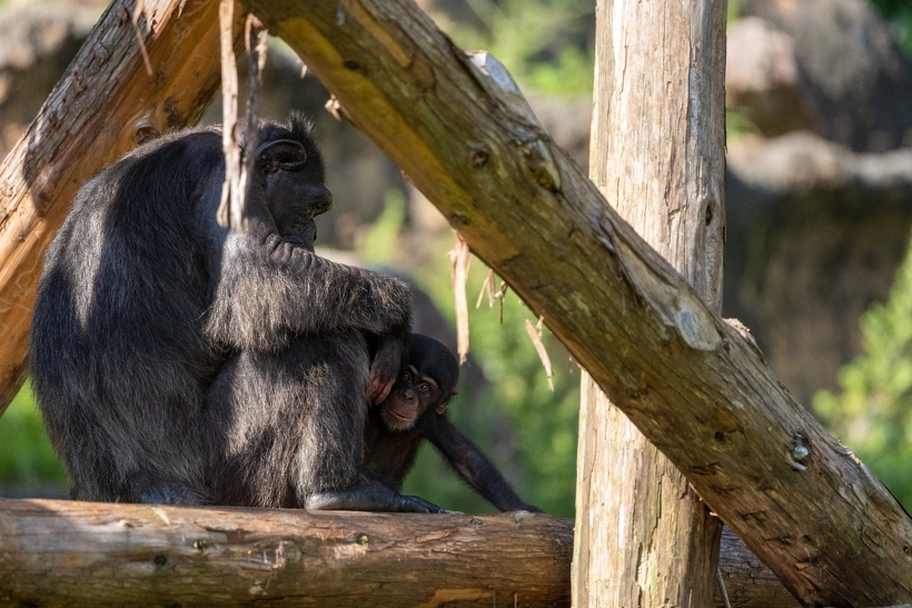 アカルが誕生して約半年が経過しました。順調に成育しています。しがみついているアカルを連れて歩くよりも、アカルを抱いて丸太タワーで休息する時間の方が多いです。お気に入りの休息場所は観覧通路から見ると丁度柱に姿が隠れて観察しにくく、カメラを準備していても写真撮影も難しい場所です。アカルの姿が見えた時にはカメラを手にしていないことも多々ありシャッターチャンスを逃しています。