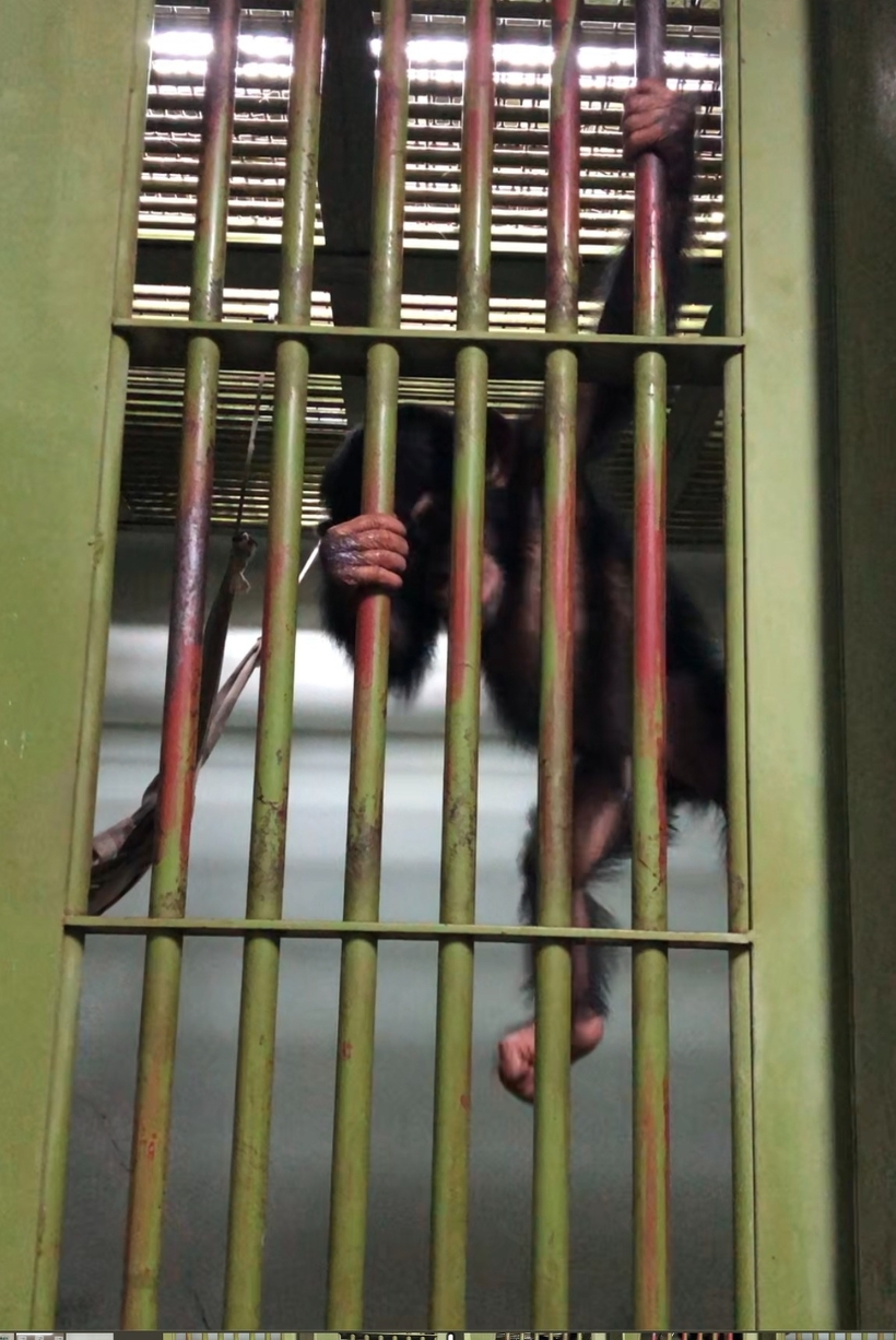 扉の格子に素早く上り自分の背の数倍高い位置でも怖がることはありません。チンパンジーらしく四足立ちからの四足歩行も見られるようになりました。今後はアカルがサンゴから離れる時間が増えて、仲間と過ごす時間が増えるのではないかと期待しています。