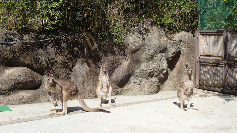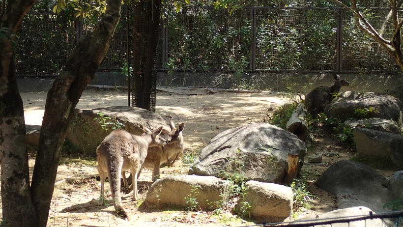 3月24日に埼玉県こども動物自然公園からやってきた「イオ」(オス)は健康チェックが無事に終わり、4月1日にはカンガルー舎に引っ越しをしました。新しい生活場所に最初は少し落ち着かない様子でしたが、すぐにエサを食べ始めて1時間もすると寝そべってリラックスした様子。翌日の4月2日からは、繁殖相手の「エマ」・「サンザ」(共にメス)とバックヤードで同居をさせてみました。初めての場所で、初めて会う「エマ」・「サンザ」ですが、落ち着いてアプローチしていました。さすがにすぐに受け入れてもらえることはありませんでしたが、しつこく追い回すこともなく、それでいてあきらめるわけでもないといった様子でした。合間にはしっかりと餌も食べて、初めての環境に動揺することはありませんでした。そして4月7日には「エマ」・「サンザ」と一緒に展示場デビューです。「イオ」は始めこそ緊張していましたが、パニックになることもなく落ち着いて展示場内を探索していました。収容時は道案内役になってくれることを期待していた「エマ」と「サンザ」はさっさと帰ってしまい「イオ」は展示場に残ってしまいましたが、職員が展示場に入って誘導すると慌てることもなく無事に帰ることができました。短期間にいろいろな環境の変化がありましたが、いつも落ち着いて適応してくれる「イオ」には感心しきりです。