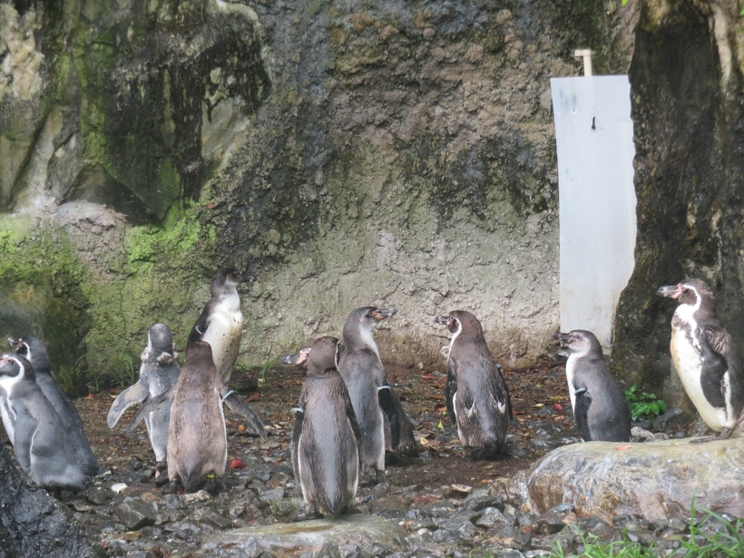 夏は苔や藻が生えるのが早いので、3~4日に1回のペースでプール清掃をします。まず朝、プールの水を抜きます。ペンギンたちは泳ぐことができず、不満げに隅っこに固まっています。