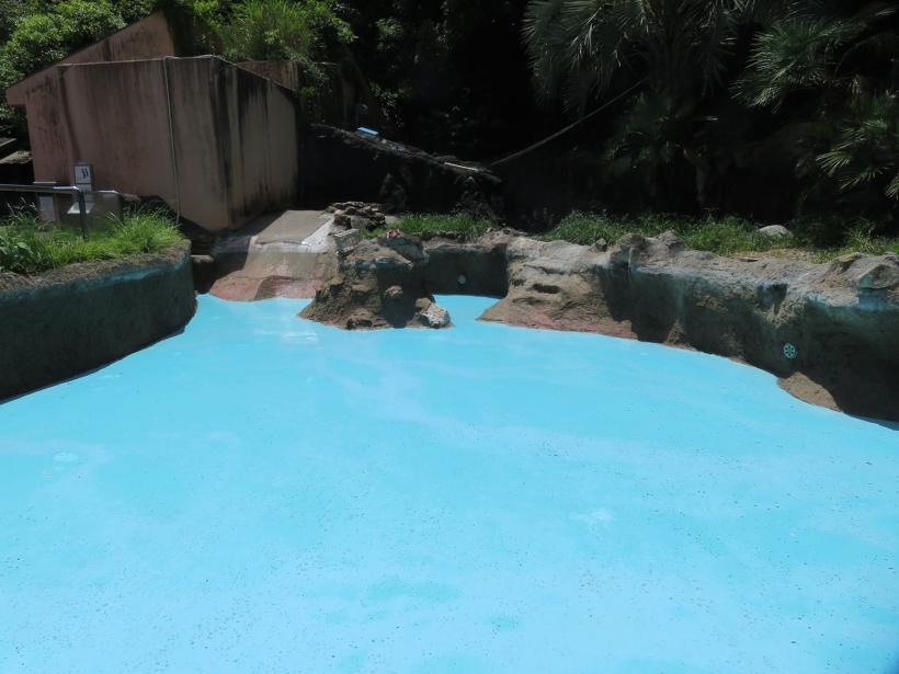 1時間後、プールの水が全て抜けきったら、長いホースを使って大まかな汚れを落とします。次に、塩素を薄めた物を壁面や底に満遍なくかけ、消毒をしていきます。最後に底をブラシでこすり、細かい汚れを落とします。これが最も大変で、こびりついた糞や尿(尿酸という白い塊)を落とすのですが、広いプールを一人で擦るのは骨の折れる作業です。