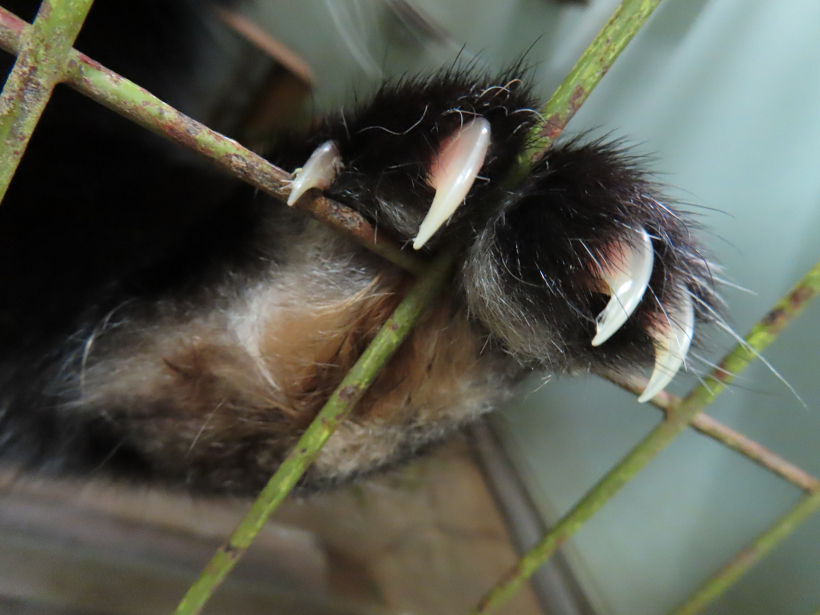 →そうだったんですね、それは大変。確かにレッサーパンダは高いところに登りやすいように、鋭いカギ爪があります。垂直の丸太も楽々と登ってしまう程なので、意外に腕力もあります。鋭い犬歯も生えているため、噛まれたり引っかかれたりしたら大けがになります。ただ、よほど追い詰められたり嫌なことをされなければ、レッサーパンダが進んで人を攻撃することはありません。とはいえそこは逞しい野生動物であるレッサーパンダたち。彼らにその気がなくても、うっかり腕を掴まれたり軽くかまれただけでも人は傷だらけになってしまいます。イヌやネコのように適度な距離を保って付き合うのが難しいのが、野生動物なのです。おうちで飼うのはやはり適切とは言えないでしょう。
