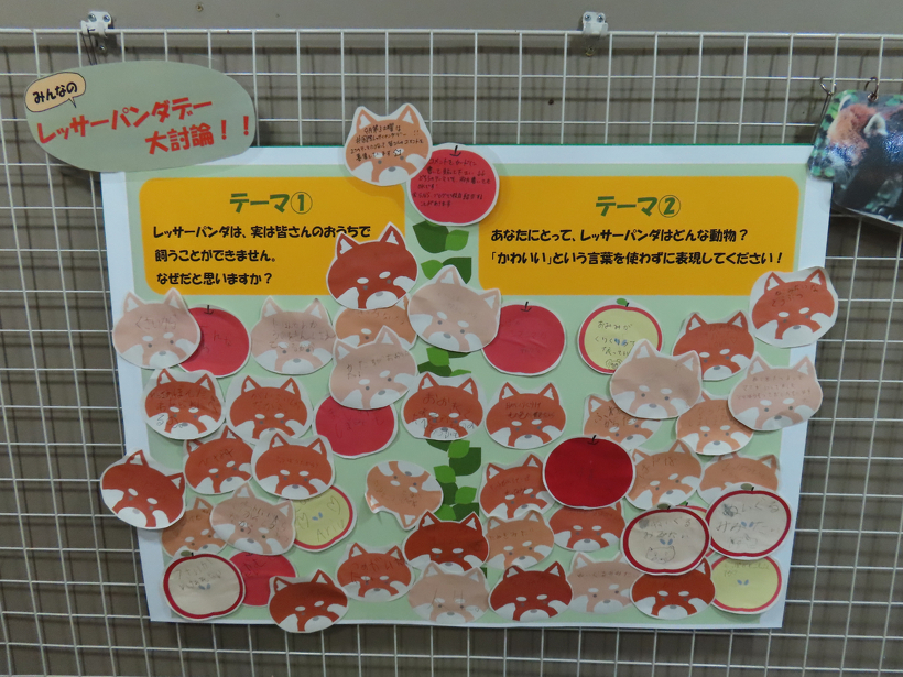 去年は質問を募集しましたが(飼育日記「みんなのギモンに答えてみた!」参照)、今年は「レッサーパンダデー大討論!」と題して、2つのテーマに沿って皆さんからのコメントを募集しました。2つのテーマを合わせて全部で 計196通のコメントが寄せられました。一生懸命考えてくださった皆さん、本当にありがとうございました。