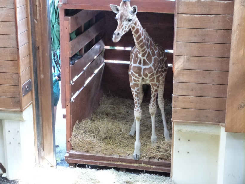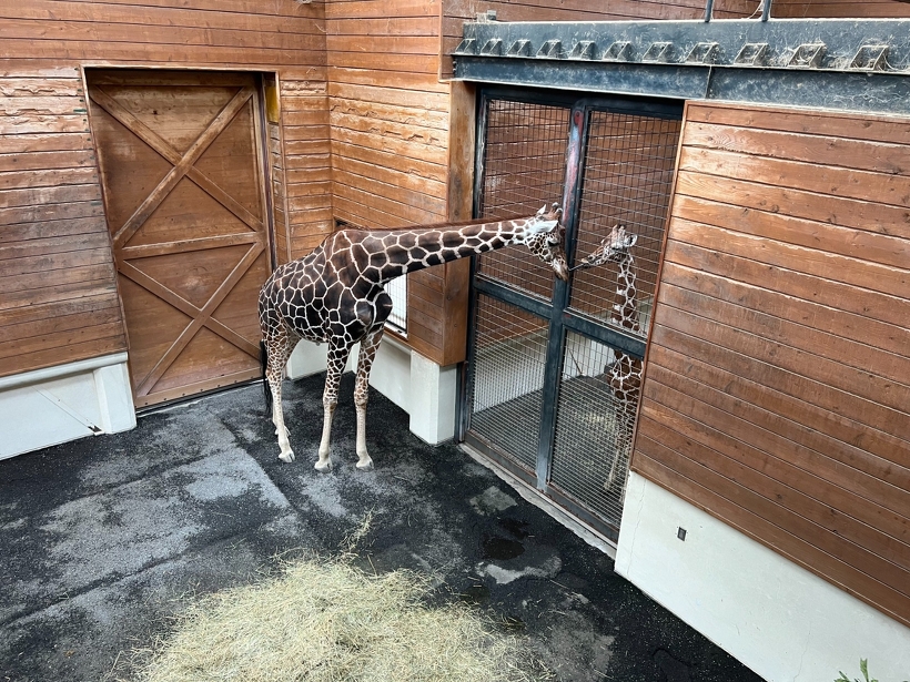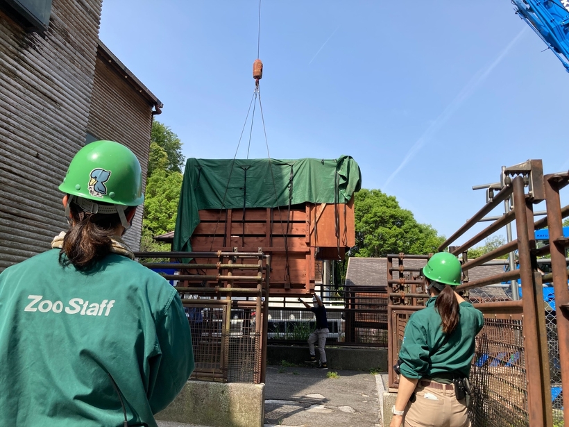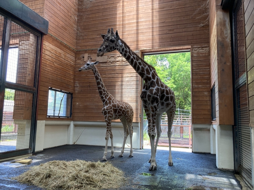 【動物ブログ】飼育日記 アミメキリン「お嫁さん候補がやって来た!!」 2022年06月27日(月) アミメキリン 5月19日の早朝、トラックの荷台に載せられた輸送箱からのぞくつぶらな瞳。 アミメキリンの「ノン」がはるばる東京都多摩動物公園からやって来ました。 昨年、「リンタロウ」と長年連れ添った「ジャネット」が逝ってしまい、もう1頭の雌、「フーピー」も高齢。 みんなが待ち望んでいたお嫁さん候補です。 トラックの荷台からクレーンでつられて下ろします。 輸送箱から獣舎に移動。「ノン」ここが新しいお家だよ。 「フーピー」おばあちゃんは暖かく見まもっている感じ。 「リンタロウ」興味津々。お嫁さん候補だから優しくしてあげてね。 展示場に馴らす練習を経て6月19日、一般公開にこぎ着けました。