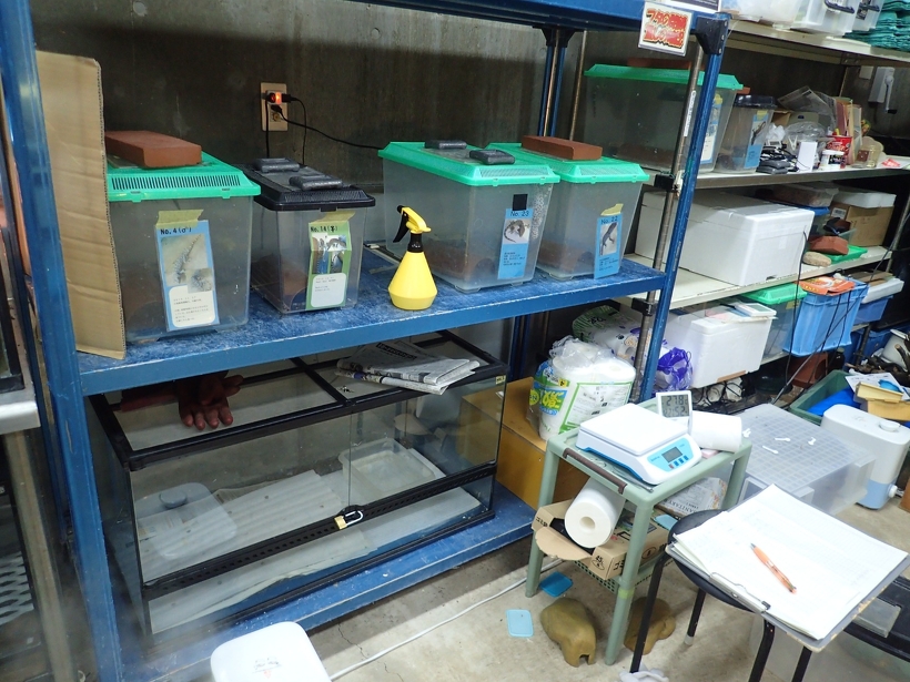 その他、現在展示しているトッケイヤモリ、コロンビアレインボーボア、セマルハコガメたちも飼育しています。ここで飼育されている個体たちは、展示場の個体が体調不良になった場合の交代要員になります。セマルハコガメは、現在展示している個体たちより後にやってきて、今は動物園での生活に慣らしているところです。サイズが大きいため展示場にいる個体と、近いうちに交代することとなる予定です。