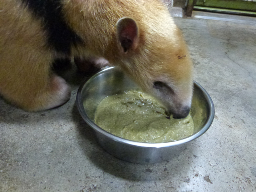 アリクイの仲間は、歯がなく長い舌を使って餌を舐めとります。野生では主にアリを食べていますが、動物園ではたくさんのアリを用意することができないため、このような代用食を与えています。