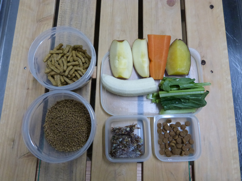 ケーキのまわりに塗ってあるのは、普段コアリクイたちが食べている餌で、リンゴ、バナナ、煮ニンジン、煮イモ、コマツナ、キャットフード、ペレット(食虫動物用、リーフイーター用)、アリなどを水と一緒にミキサーでドロドロにしたものです。