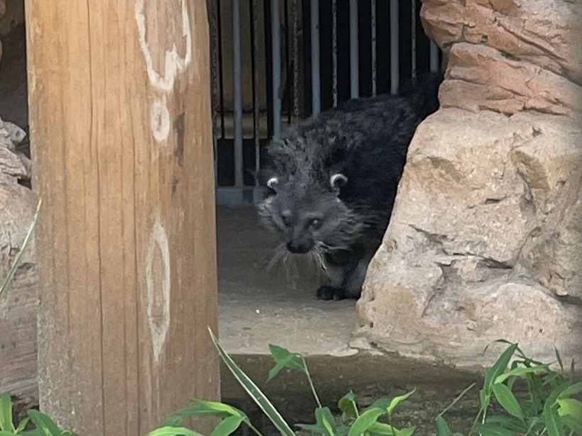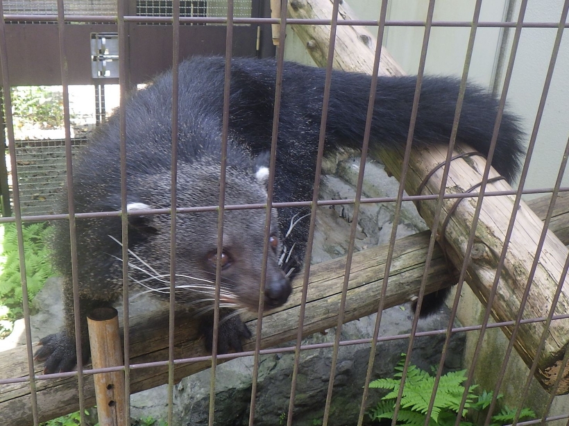 そして全ての日程終了後に、せっかくなので熊本まで足を伸ばすこととし、今年3月に移動したビントロングの「ネー」にも会ってきました。とても立派な施設で大事に飼われていましたが、どうやらまだまだ新しい環境に慣れていないようで、展示場奥の方でずーっと隠れたままでした。のいちでは母親のケチャップとの同居で甘やかされていましたし、単独生活が初めてということもあってなかなか本来の動きができないようです。少し離れたところにいるオスの「ブーン」は逆に全く物怖じしない性格のようなので、早いところ仲良くなって欲しいですね。