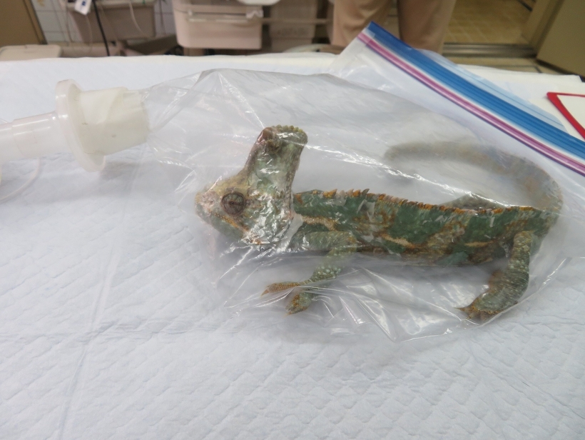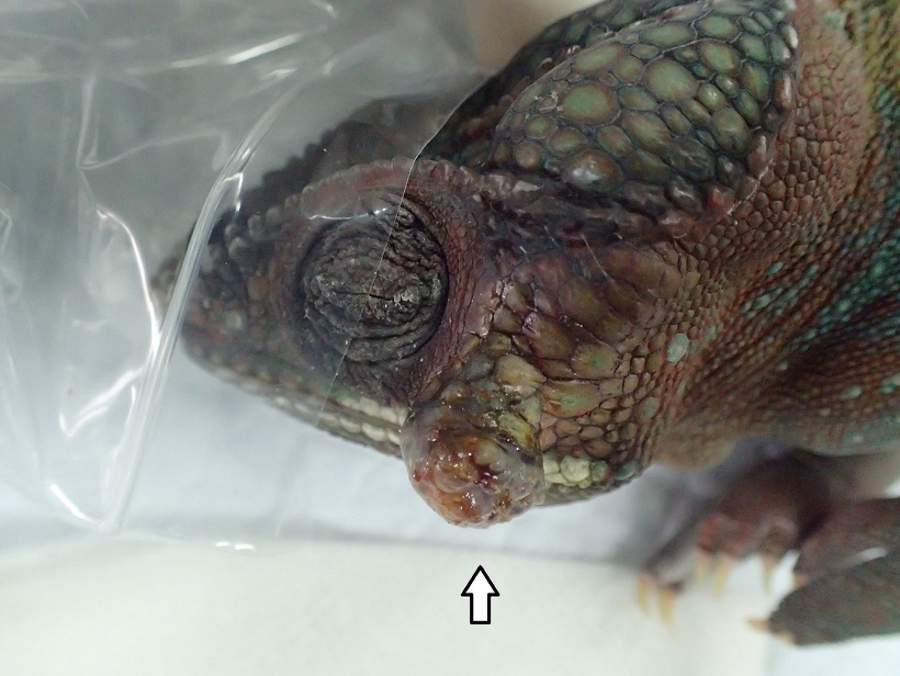 カメレオンに麻酔をかけるのが初めてだったので、緊張しましたが無事に処置することができました。腫瘍の病理検査結果は、扁平上皮癌という悪性腫瘍でした。