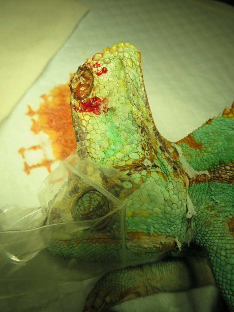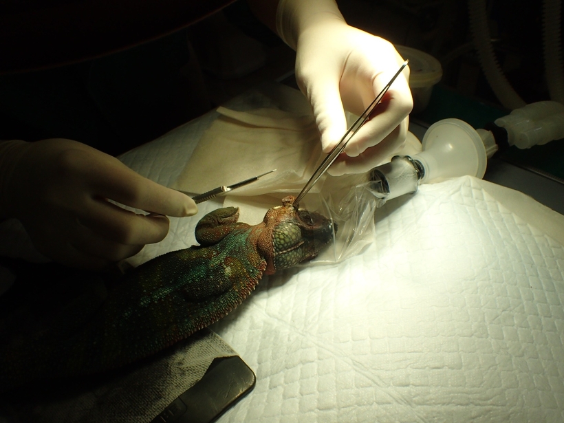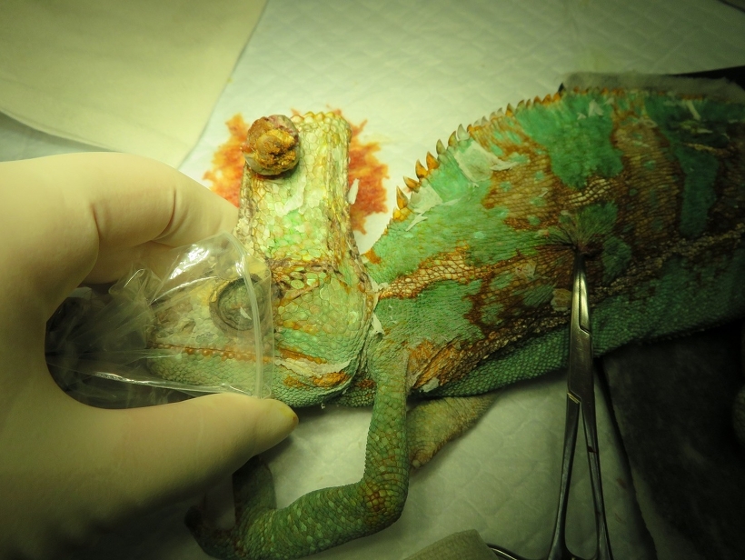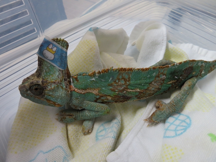 2021/4/2に今度はエボシカメレオンの4番ちゃんのエボシ部分(頭部)と左腹部にできた腫瘤を摘出しました。実は1年以上前から腫瘤があったのですが、大きさに変化がなかったためイボの類ではないかと様子見ていました。ところが、3月下旬より急激に拡大し悪性腫瘍らしき様子を示してきたので摘出しました。