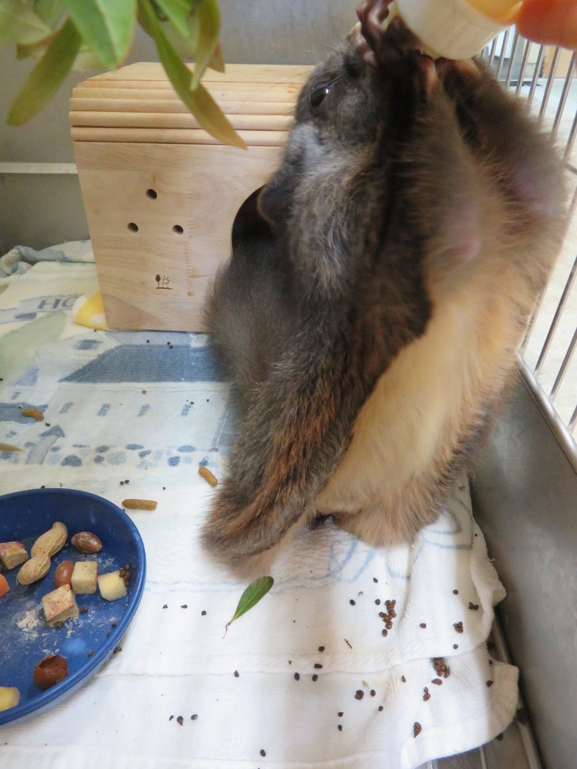 今はまだケージ内での生活ですが、今後はミルクを完全に切って、屋外にある少し広いスペースに移して、飛ぶ練習もして、やまももなどの枝葉をたくさん食べるようにして、無事に野生に返せたらと思います。