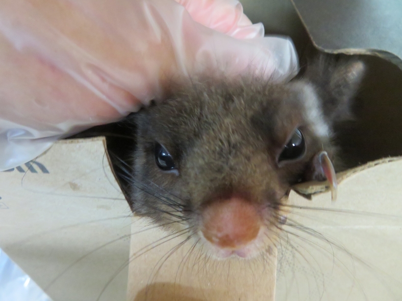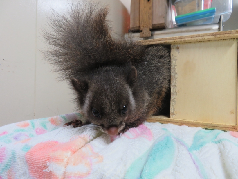 動物園に保護されてくる動物たちの多くが、交通事故や巣のある木が伐採されるなどの理由でやってきます。このムササビも巣の破壊が理由でした。