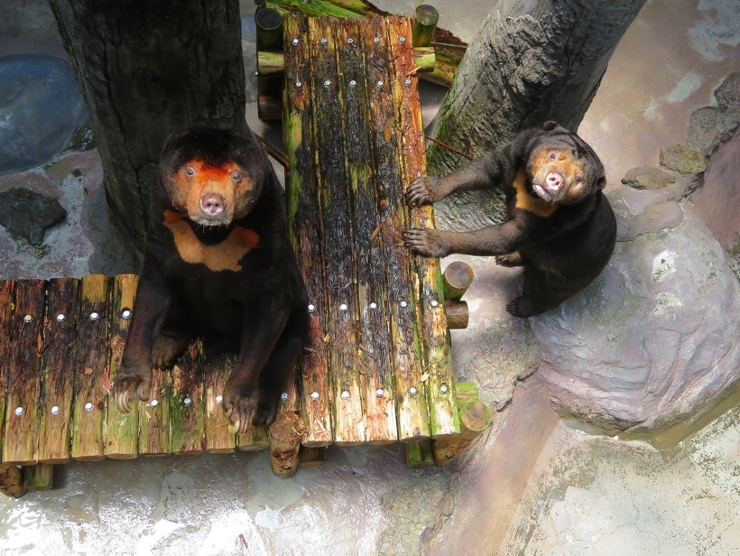 マレーグマのタオチイ(メス)は27歳、ワンピイ(オス)も同い年で、日本の動物園にいるマレーグマの中では3番目に高齢です。飼育下での平均的な寿命は25年くらいとされていますので、2頭はお年寄りの仲良し夫婦です。