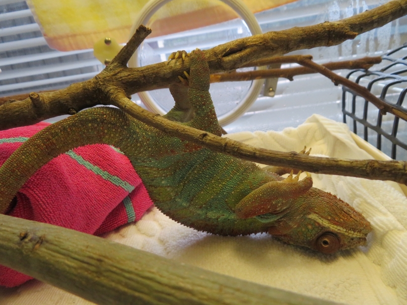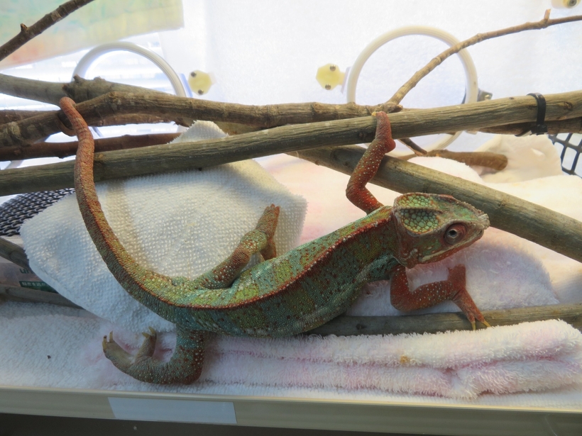カメレオンの5番ちゃんは10月に口の中にできた腫瘤を摘出して、自力採食を期待しましたが、もともと舌も伸びないためうまく食べられず、そのまま入院しています。高齢でもあり、だんだん掴む力が弱まっていて、時々枝からずり落ちておもしろい格好になっています。