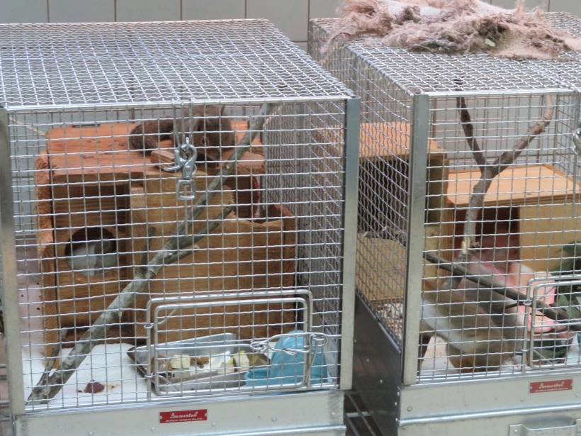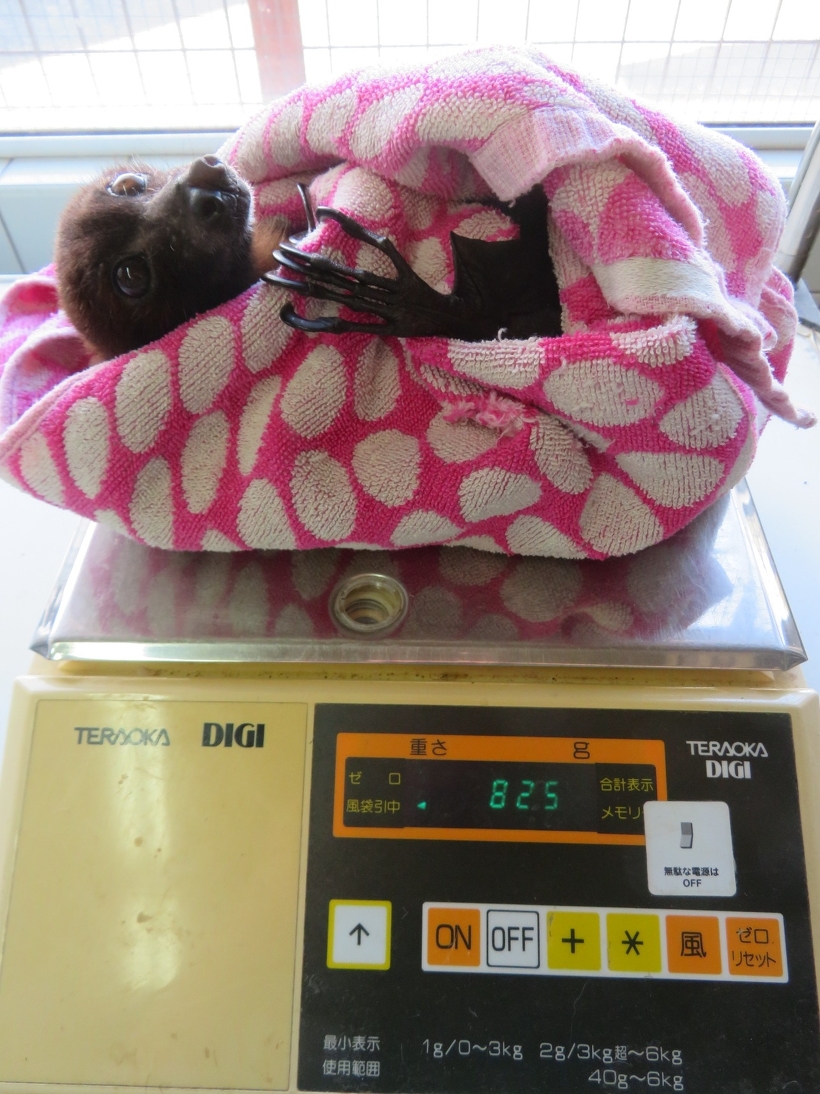 ルーセットオオコウモリのNo.26番ちゃんは左腕を骨折し、髄内ピンを入れて治療中です。夜行性のため昼間はこっそり過ごしていてあまり存在感がないですが、夜入れたご飯は朝ウンチに変わっていて、よしよしと思いながら掃除しています。顔は可愛いですが、嫌なことは嫌というタイプです。