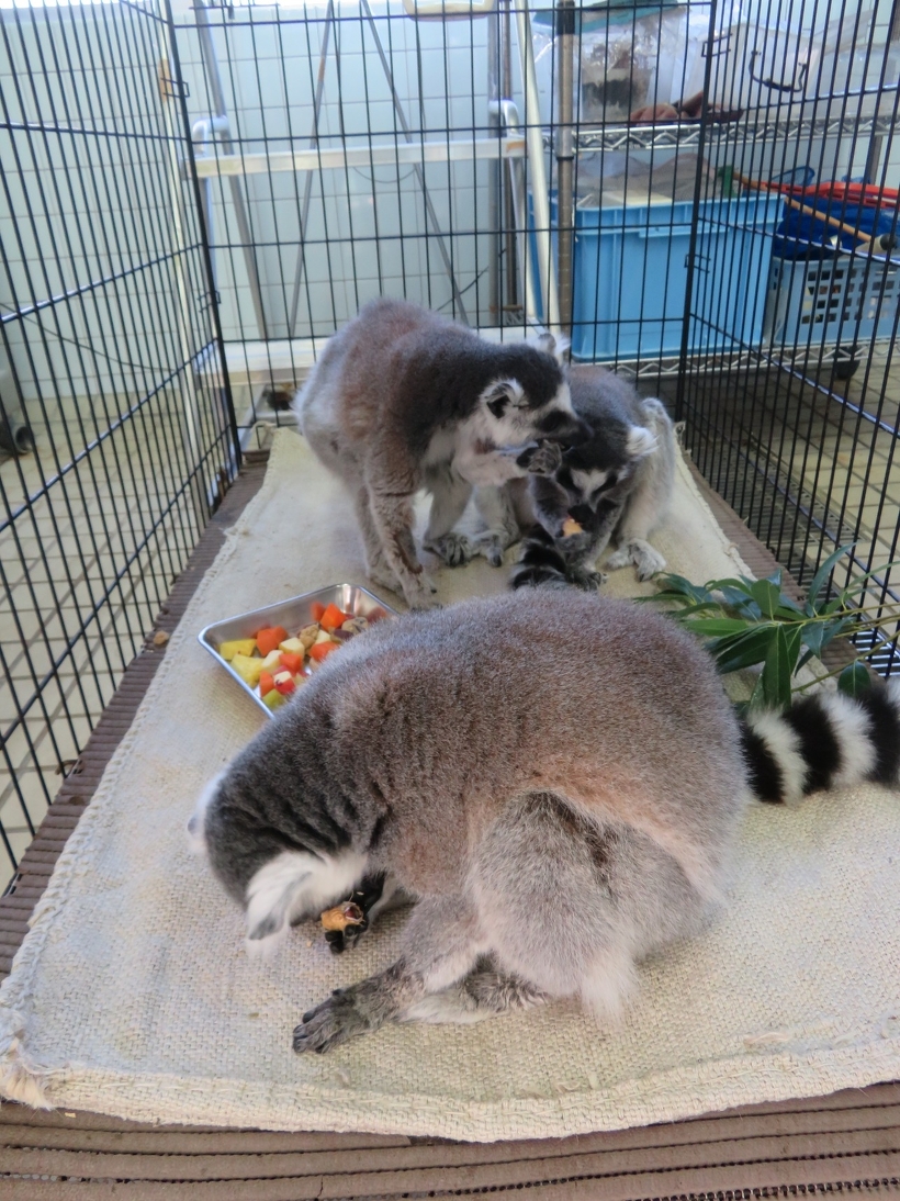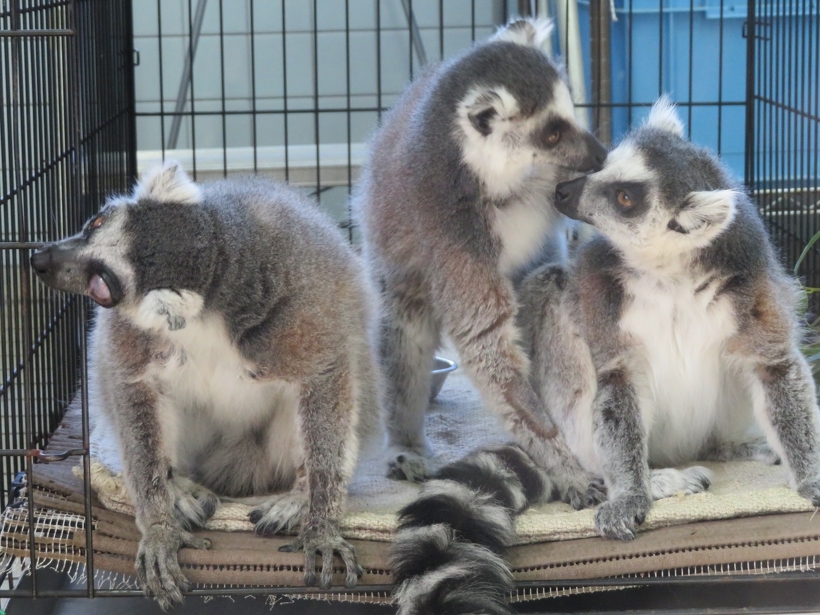 ケアホームワオ!のワオキツネザル3頭はそれなりに毎日のんびり過ごしています。夜はそれぞれ個室なので、朝みんなに会って挨拶して、集まってなんかモグモグしてちょっと楽しそうです。アンナとコナツは、飼育員の作ってくれた畑の野草がお気に入りで、少し食欲が低い時も野草には興味を持って食べてくれていました。ジョン君は寝ていることが多く、ちょっとずつみんな数年前よりは老いを感じます。