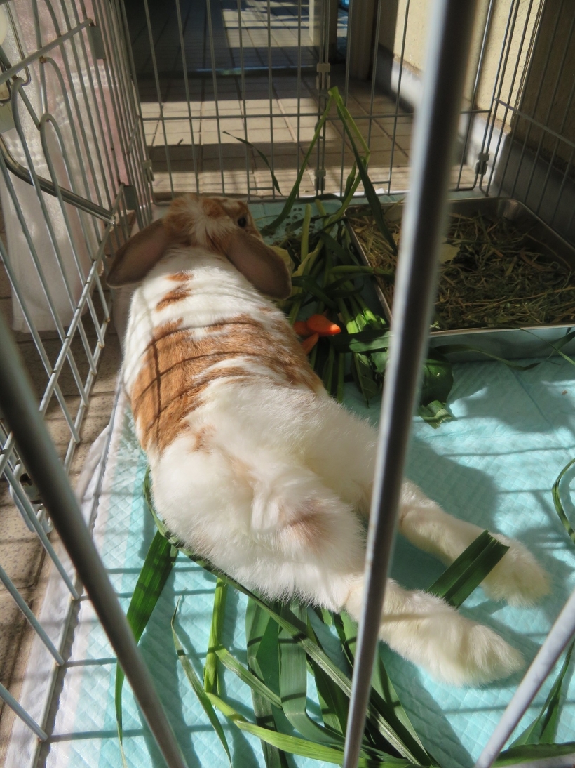 ウサギのアイちゃんは11月に乳がんの摘出後しばらく入院しています。もともと人見知りタイプですが、長期の入院生活に慣れたのか日光浴しながら意外とくつろいで伸びて過ごしてくれています。もうすぐ退院予定です。
