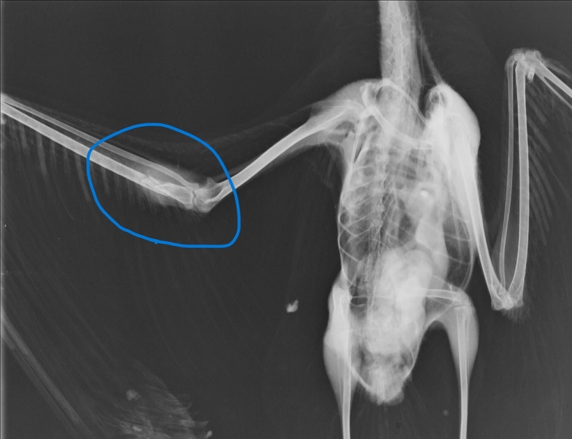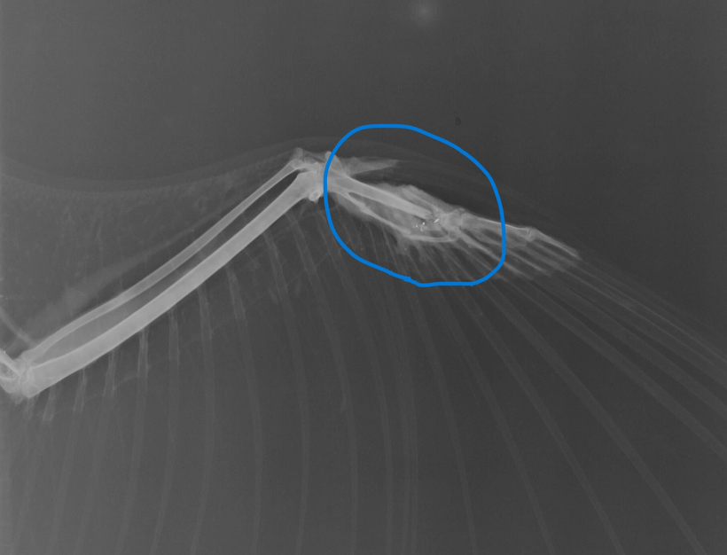 10月15日、高知空港近くで飛べないトビが保護されました。レントゲン検査の結果、右翼の手根部が骨折しており、ガリガリに痩せていました。