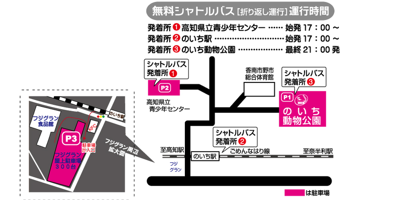- 当日は大変混雑が予想されます。できる限り、公共交通機関をご利用願います。 ごめんなはり線を利用し、ご来園頂いた方は入園料が2割引(470円→370円)となります。 また、のいち駅と青少年センターからは無料シャトルバスを運行しますのでご利用ください。
