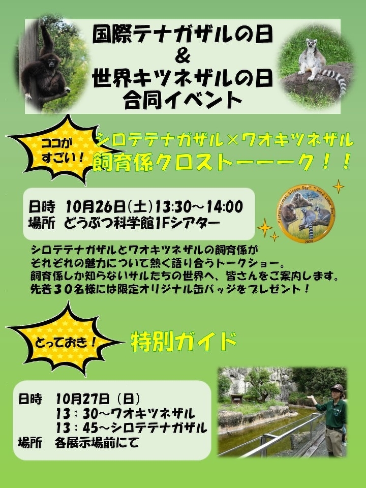 内容:シロテテナガザル/ワオキツネザルの飼育係がそれぞれの魅力について語り合うトークショーです。皆様にテナガザル・キツネザルの質問を募集し、その質問の中からお答えします。先着30名様には限定オリジナル缶バッチをプレゼント!
