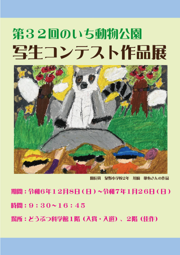 ※終了しました。第32回 のいち動物公園 写生コンテスト作品展 【展示期間】令和6年12月8日(日)~令和7年1月26日(日) 第32回写生コンテストは、県内外888名の小学生からご応募いただきました。 のいち動物公園の動物たちがいきいきと描かれていますので、ぜひご覧ください。 展示期間 令和6年12月8日(日)~令和7年1月26日(日) 時間 9:30~16:45 場所 どうぶつ科学館1階(入賞・入選)、2階(佳作) 展示数 入賞122点・佳作127点