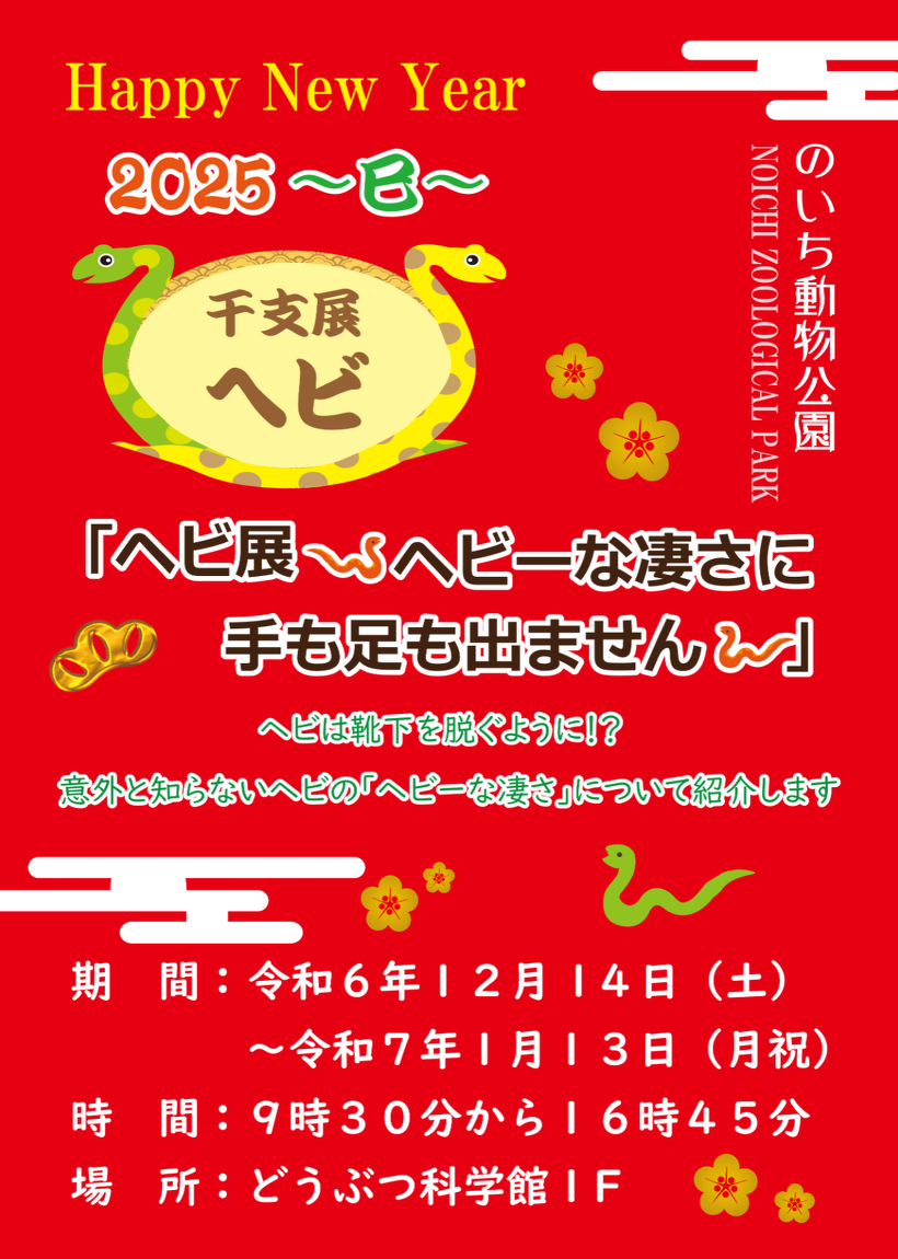 ※終了しました 干支展「ヘビ展~ヘビーな凄さに手も足も出ません~」 令和6年12月14日(土)~令和7年1月13日(月祝) ヘビは靴下を脱ぐように!?意外と知らないヘビの「ヘビーな凄さ」について紹介します。 その他、ヘビの抜け殻標本の展示や「ニョロニョロお巳くじ(おみくじ)」もあります。ぜひお越しください♪ 期間 令和6年12月14日(土)~令和7年1月13日(月祝)まで 時間 9:30~16:45 場所 どうぶつ科学館1F