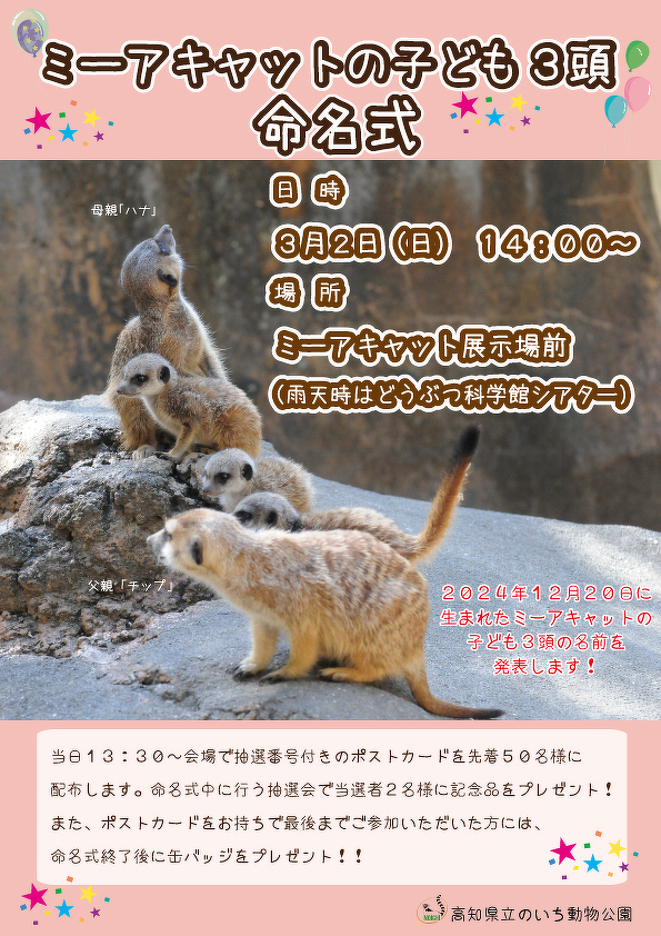 ※終了しました ミーアキャットの子ども3頭の命名式 令和7年3月2日(日)14:00~ (13:30~先着50名様に抽選番号付きのポストカードを配布) 2024年12月20日に生まれたミーアキャットの子ども3頭の命名式を下記の日程で行います。 日 時 3月2日(日) 14:00~ 場 所 ミーアキャット展示場前(雨天時はどうぶつ科学館1階シアター) 内 容 13:30~ 命名式開始前に抽選番号付きのポストカードを配布(先着50名様) 14:00~ 命名式 ※また命名式中に行われる抽選会にて、当選者2名に記念品をプレゼント! ※ポストカードをお持ちで最後までご参加いただいた方には、命名式終了後に缶バッジをプレゼントします。