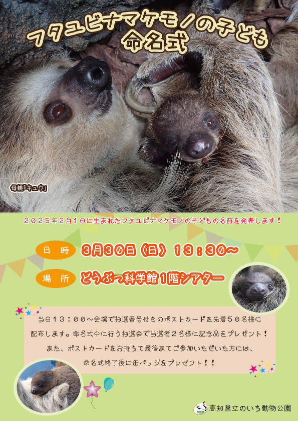 ※終了しました。フタユビナマケモノの子どもの命名式 令和7年3月30日(日)13:30~ (13:00~先着50名様に抽選番号付きのポストカードを配布) 2025年2月1日に生まれたフタユビナマケモノの子どもの命名式を下記の日程で行います。 日 時 3月30日(日) 13:30~ 場 所 どうぶつ科学館1階シアター 内 容 13:00~ 命名式開始前に抽選番号付きのポストカードを配布(先着50名様) 13:30~ 命名式 ※また命名式中に行われる抽選会にて、当選者2名様に記念品をプレゼント! ※ポストカードをお持ちで最後までご参加いただいた方には、命名式終了後に缶バッジをプレゼントします。