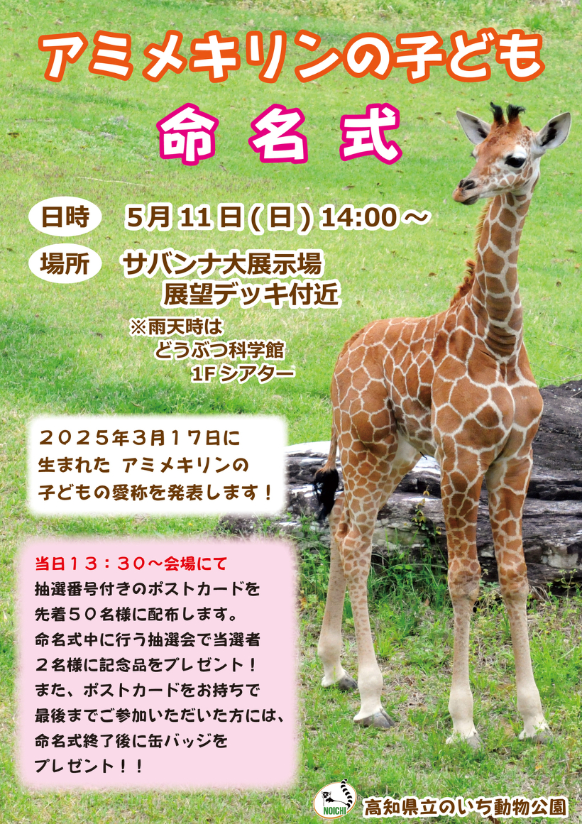 ※終了しました アミメキリンの子ども命名式 2025年5月11日(日)14:00~ (13:30~先着50名様に抽選番号付きのポストカードを配布) 2025年3月17日に生まれたアミメキリンの子どもの命名式を下記の日程で行います。 日 時 5月11日(日) 14:00~ 場 所 サバンナ大展示場 展望デッキ付近 (雨天時はどうぶつ科学館1階シアター) 内 容 13:30~ 命名式開始前に抽選番号付きのポストカードを配布(先着50名様) 14:00~ 命名式 ※また、命名式中に行う抽選会にて、当選者2名様に記念品をプレゼント! ※ポストカードをお持ちで最後までご参加いただいた方には、命名式終了後に缶バッジをプレゼントします。