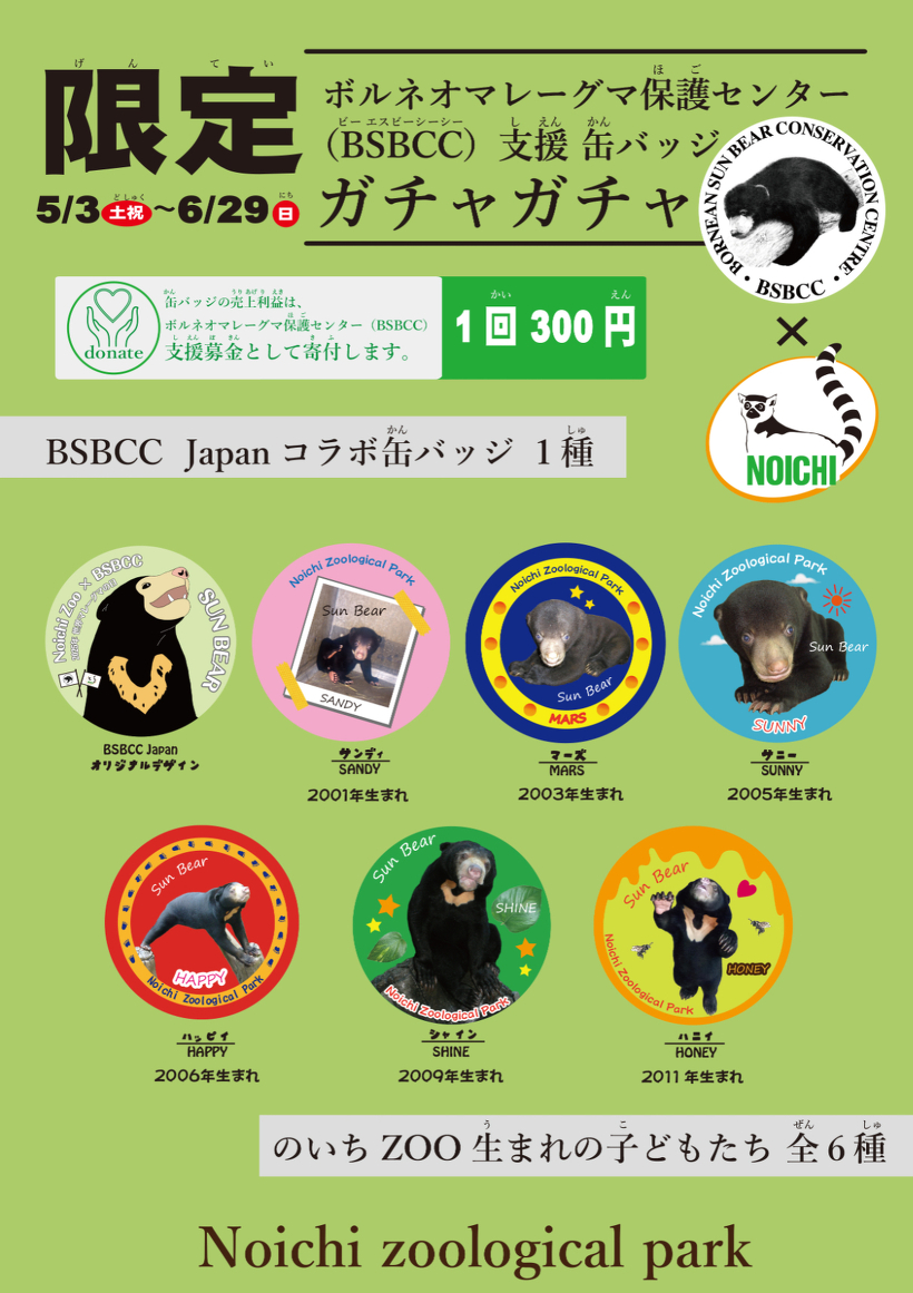 ※終了しました ボルネオマレーグマ保護センター(BSBCC)支援ガチャガチャコーナー 2025年5月3日(土祝)~6月29日(日) 5/18に開催した「のいちとボルネオをつなぐ~マレーグマファンあつマレー第3弾~」の関連イベントとして、BSBCC(ボルネオマレーグマ保護センター)支援ガチャガチャコーナーを設置しています。 缶バッジの種類は計7種類!BSBCC Japan(ボルネオマレーグマ保護センタージャパン)とのコラボ缶バッジもあります♪ 期間限定で今しか手に入らないオリジナル缶バッジです!ぜひご購入ください! ※缶バッジの売上利益は、BSBCC支援募金として寄付します。 期間 2025年5月3日(土祝)~6月29日(日) 場所 どうぶつ科学館1階(入口付近)