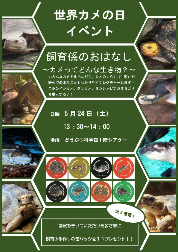 ※終了しました 世界カメの日のイベント 2025年5月24日(土) 13:30~14:00 5月23日(金)は「世界カメの日」です。 そこで、カメの担当者による飼育係のおはなしを下記の日程で開催します。 日時 5月24日(土) 13:30~14:00 場所 どうぶつ科学館1階シアター カメはどんな生き物なのか、いろんなカメを比べながらカメのくらし(生態)や野生での困りごともわかりやすくレクチャーします! 講演をきいていただいた皆さまには、飼育係手作りの缶バッジを1つプレゼント!ぜひ、お越しください。