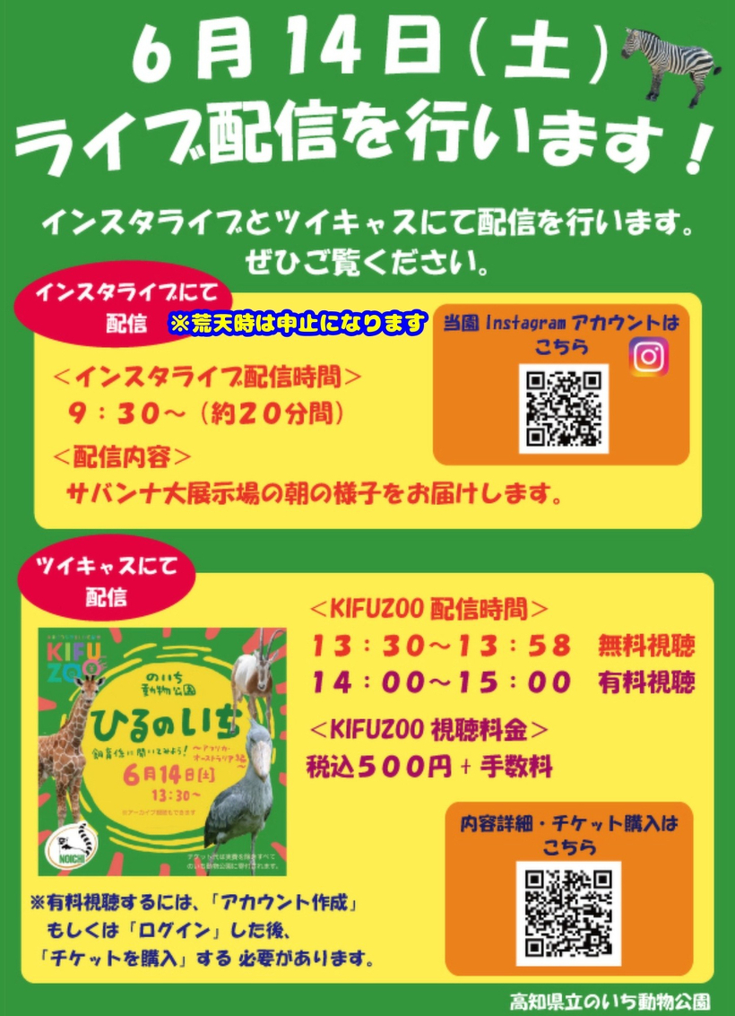 また、同日の9:30からはインスタライブを行います。サバンナ大展示場の放飼の様子をお届けする予定です。皆さまぜひご覧ください。(荒天時は中止となります)