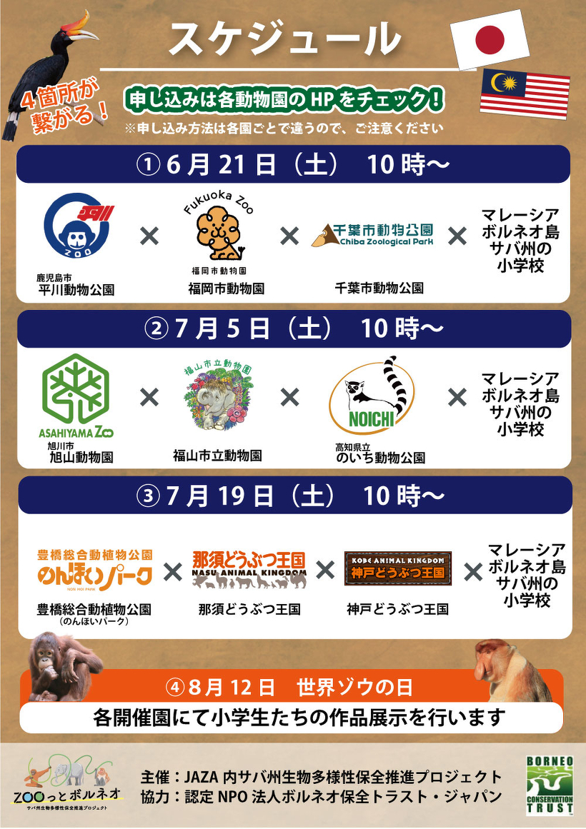 私たちにできることは何か。日本の動物園3園(旭山動物園・福山市立動物園・のいち動物公園)とボルネオ島(マレーシアサバ州)の小学校をオンラインで繋ぎ、クイズやゲーム、動画を交えながら学びます。