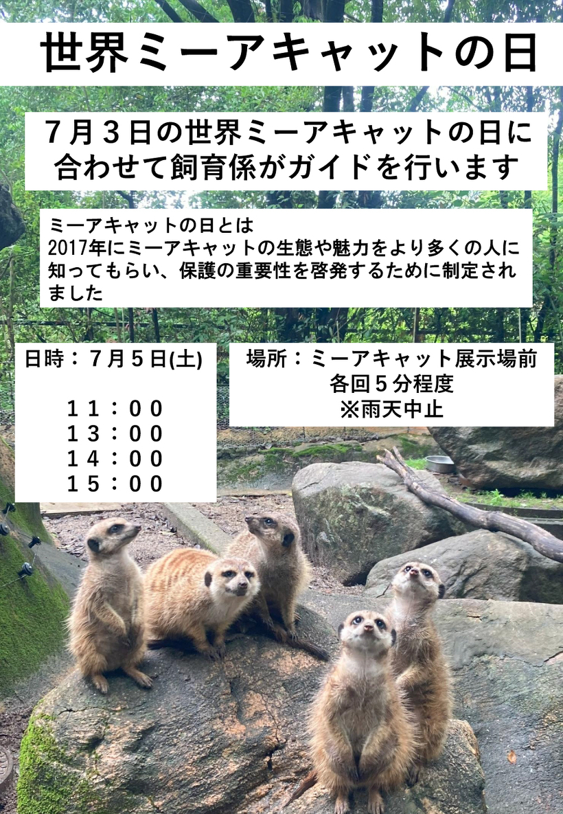 ※終了しました 世界ミーアキャットの日イベント 2025年7月5日(土) 11:00~、13:00~、14:00~、15:00~ 7月3日は「世界ミーアキャットの日」です。そこで、7月5日(土)に飼育係のガイドを4回行います。ぜひお越しください。 日 程 7月5日(土)※雨天中止 場 所 ミーアキャット展示場前 時間帯 各回5分程度 ①11:00~ ②13:00~ ③14:00~ ⑤15:00~
