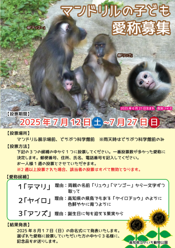 【投票場所】マンドリル展示場前、どうぶつ科学館前 ※雨天時はどうぶつ科学館前のみ