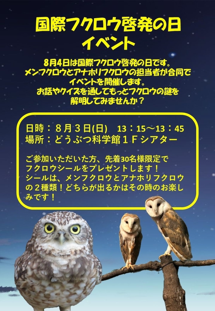 ※終了しました 国際フクロウ啓発の日イベント 2025年8月3日(日)13:15~13:45 8月4日は「国際フクロウ啓発の日」です。それに伴い、国際フクロウ啓発の日のイベントを下記の日程で行います。 日時 8月3日(日) 13:15~13:45 場所 どうぶつ科学館1階シアター メンフクロウとアナホリフクロウの担当者が合同でイベントを開催します。 お話やクイズを通してもっとフクロウの謎を解明してみませんか? ご参加いただいた方には、先着30名様限定でフクロウシールをプレゼントします! シールは、メンフクロウとアナホリフクロウの2種類!どちらが出るかはその時のお楽しみです!