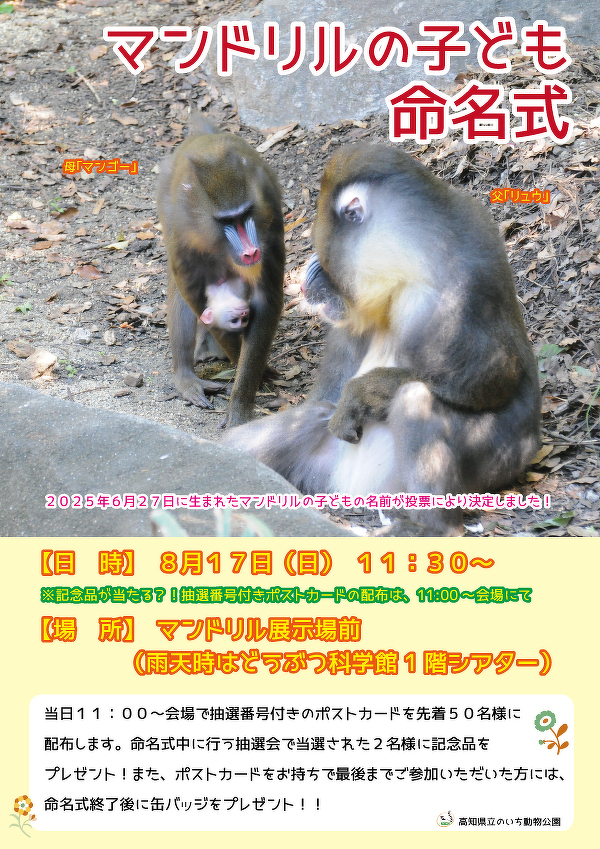 ※終了しました マンドリルの子ども 命名式 2025年8月17日(日)11:30~ (11:00~先着50名様に抽選番号付きのポストカードを配布) 2025年6月27日に生まれたマンドリルの子どもの命名式を下記の日程で行います。 日 時 8月17日(日) 11:30~ 場 所 マンドリル展示場前(雨天時はどうぶつ科学館1階シアター) 内 容 11:00~ 命名式開始前に抽選番号付きのポストカードを配布(先着50名様) 11:30~ 命名式 ※また、命名式中に行う抽選会にて、当選された2名様に記念品をプレゼント! ※ポストカードをお持ちで最後までご参加いただいた方には、命名式終了後に缶バッジをプレゼントします。