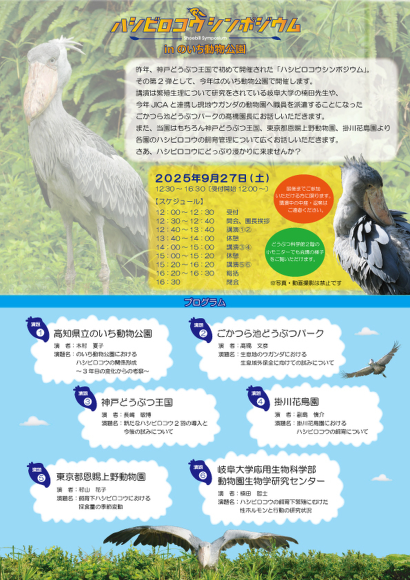 また、当園はもちろん神戸どうぶつ王国、東京都恩賜上野動物園、掛川花鳥園からは各園のハシビロコウの飼育管理について広くお話しいただきます。