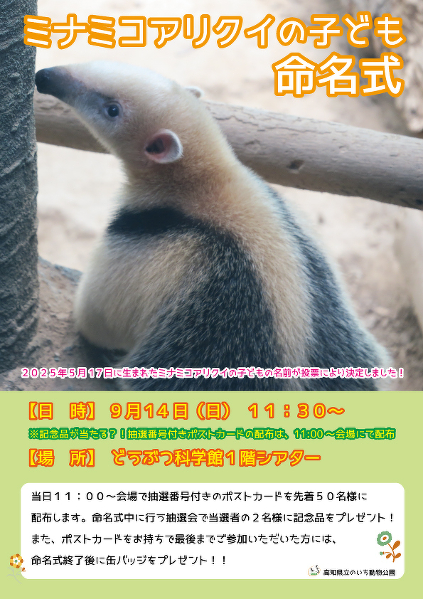 ※終了しました ミナミコアリクイの子ども 命名式 2025年9月14日(日)11:30~ (11:00~先着50名様に抽選番号付きのポストカードを配布) 2025年5月17日に生まれたミナミコアリクイの子どもの命名式を下記の日程で行います。 日 時 9月14日(日) 11:30~ 場 所 どうぶつ科学館1階シアター 内 容 11:00~ 命名式開始前に抽選番号付きのポストカードを配布(先着50名様) 11:30~ 命名式 ※また、命名式中に行う抽選会にて、当選された2名様に記念品をプレゼント! ※ポストカードをお持ちで最後までご参加いただいた方には、命名式終了後に缶バッジをプレゼントします。