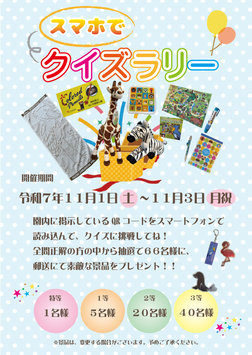 ※終了しました 2025開園記念日イベント「スマホでクイズラリー」 開催期間 2025年11月1日(土)~11月3日(月祝) 2025開園記念日イベント「スマホでクイズラリー」 開催期間:2025年11月1日(土)~11月3日(月祝) 応募方法:上記の期間に園内に設置しているクイズ問題のQRコードをスマートフォンで読み込み、応募してください。 全問正解者の中から、抽選で66名様に景品をお送りします。当選者の発表は、景品の発送をもってかえさせていただきます。 クイズの答えは、11月4日(火)にHPにてお知らせします。 ※当選した場合の景品郵送のため、個人情報の入力が必須になっています。ご了承ください。